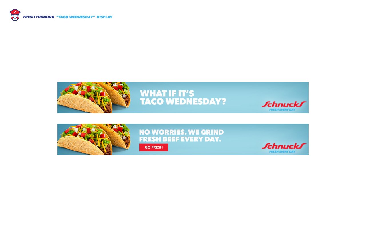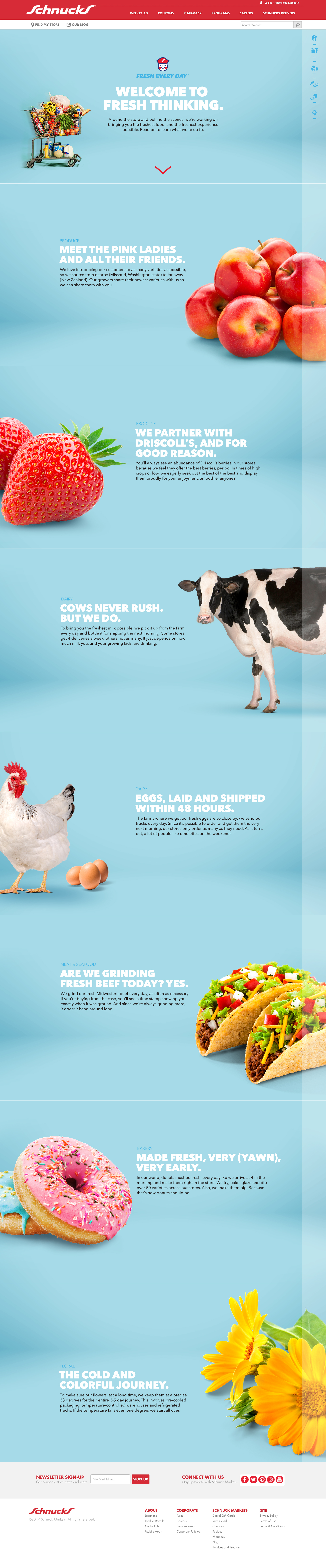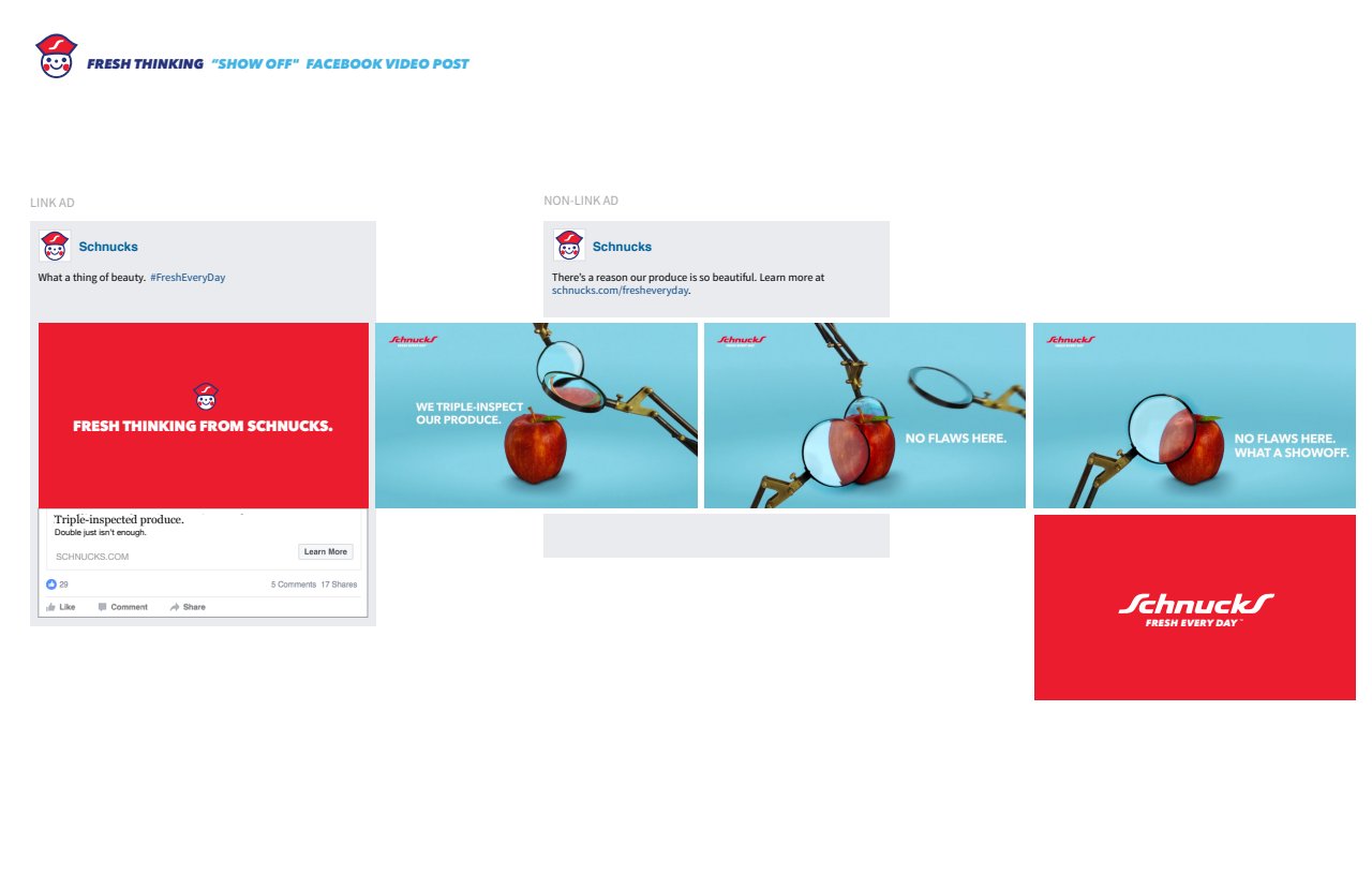 This fresh new look for Schucks Grocery Stores rolled out in October of 2017. Another team sold the idea and handled the TV edit. I jumped into display, social and wrapping up the landing page, along with image retouching and finishing of Facebook images.