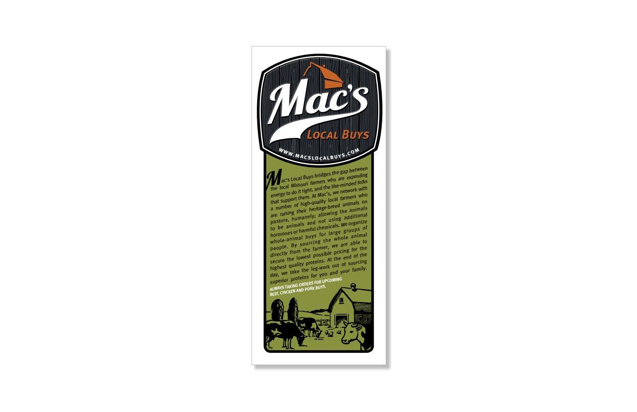 Mac’s Local Buys started as a concept in organizing cow-shares sourced from local farms. He needed branding for a wide range of applications, from hanging banners and social media to package labels, t-shirts, and flyers. To fit this range of needs, I developed a flexible identity system.