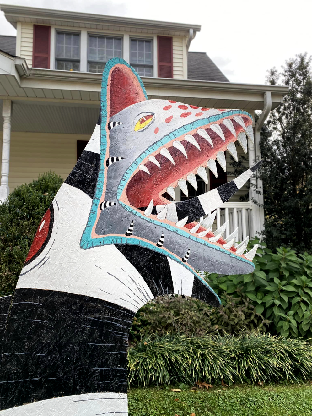 My wife, a huge fan of both Halloween and the Beetlejuice movie, mentioned to me how her dream was to have a Sandworm to decorate our front yard around the holiday. When Covid hit, I found myself with some extra time and inspiration. I proceeded to cut 3 sheets of plywood into the base form I sketched out and painted the monstrosity right in my driveway, much to my neighbor’s dismay.
