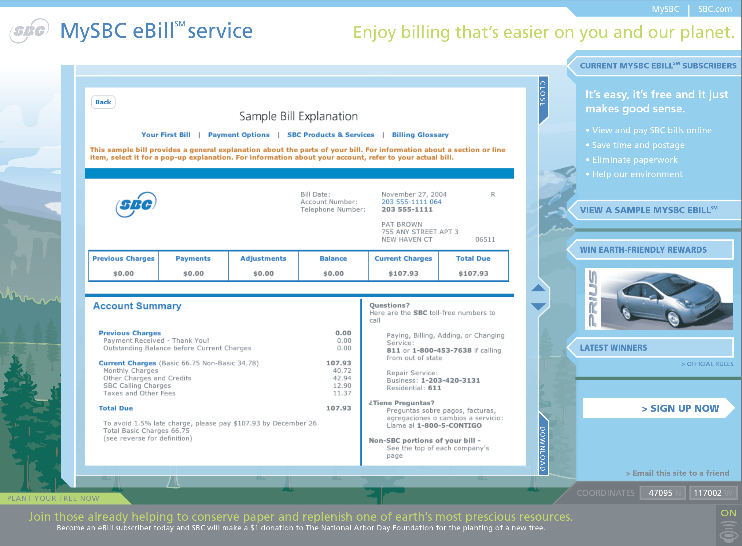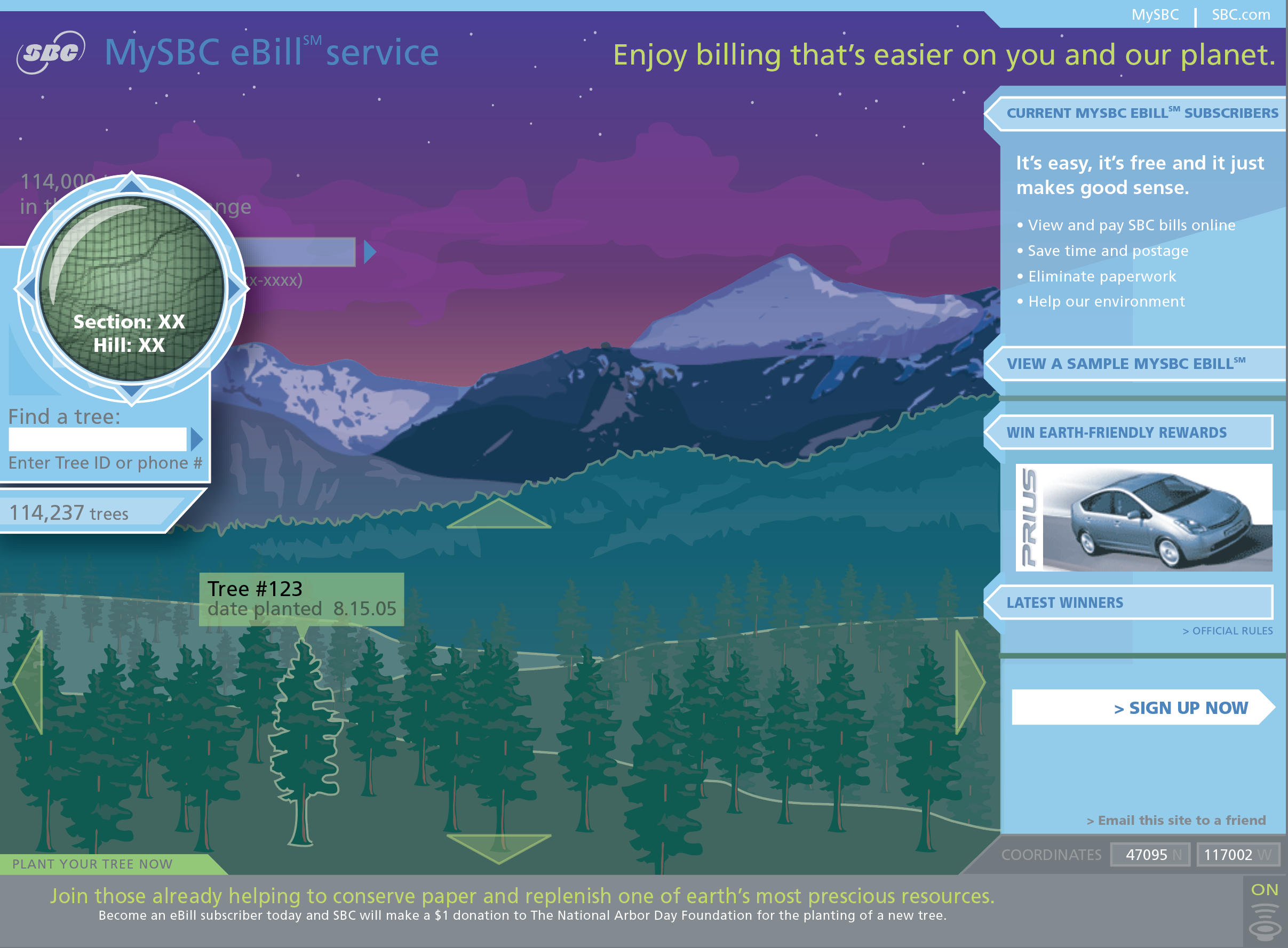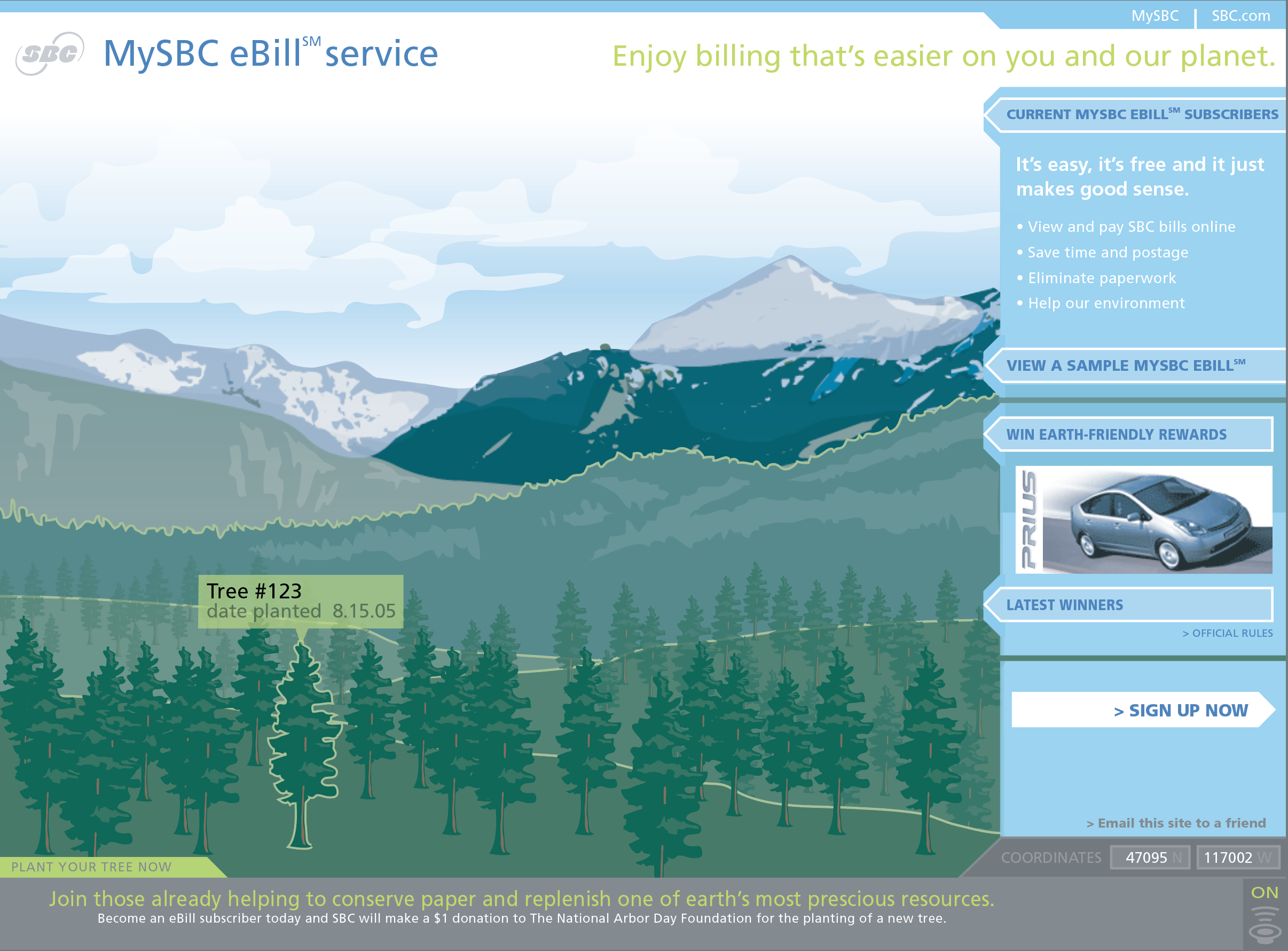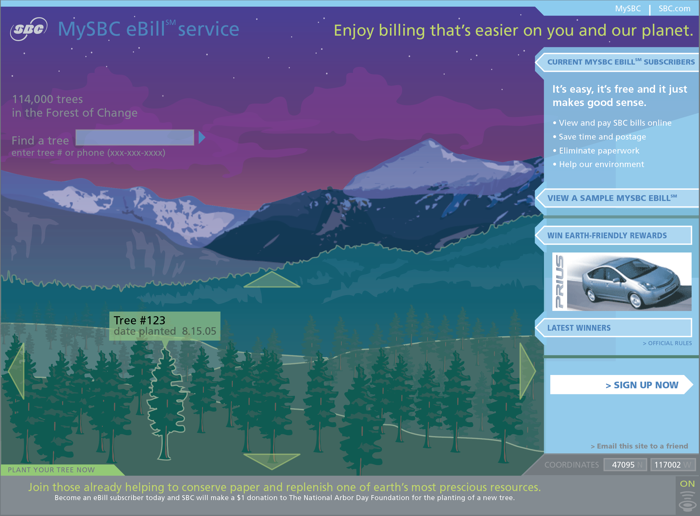 Yes, this is practically vintage, but it was groundbreaking at the time. For each new eBill sign-up with SBC, we planted a virtual tree in a virtual forest—nearly 500,000 in just a few months. Each sign-up also gave $1 to The National Arbor Day Foundation to plant real trees.